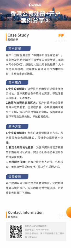 近年来,越来越多的中国企业通过香港架构实现跨境经营、税务优化与资金合规流转。无论是跨境电商、外贸出口,还是协会组织、海外业务拓展,企财盈集团凭借丰富实战经验与专业服务能力,助力企业高效完成香港公司注册与银行开户,实现安全、低税、可持续的国际化运营。
