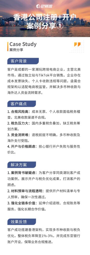 今天分享企财盈集团的一个香港公司注册+开户的案例。这位客户是成都的一家潮玩跨境电商企业主,主营北美市场,该客户主要面临这些困难: