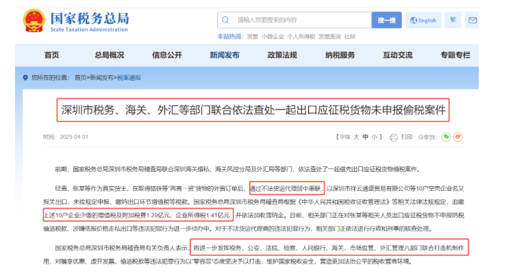 今年4月,深圳某外贸企业被查实通过10家空壳公司报关出口铬铁等货物,涉嫌逃税2.7亿元。税务机关依法追缴增值税及附加1.29亿元、企业所得税1.41亿元,并加收滞纳金。