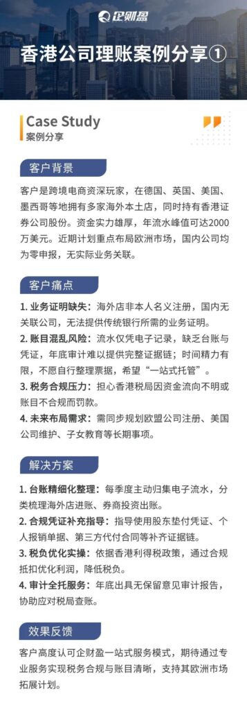 最后,客户高度认可企财盈集团的一站式服务模式,期待通过专业服务实现税务合规与账目清晰,支持其欧洲市场拓展计划。我们从以上案例中看到,无论是流水庞大却无票可依的电商头部企业,还是因历史风险畏步的传统企业,或是成长型电商公司,其共性痛点均为凭证缺失、准则误用、证据链断裂。企财盈以季度理账为切入点,结合凭证规范、离岸豁免前置规划等,将理账从“成本支出”转化为“省税合规”的基石,真正守护企业利润与跨境发展安全。如果你的香港公司需要税务合规或者理清季度账目,可以随时咨询(微信同号:13045886252)▼▼▼