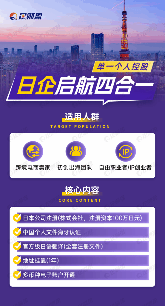 ● 日企启航四合一(单一个人控股):3万+(含注册费、海牙认证代办、全套翻译、首年地址托管、电子账户);