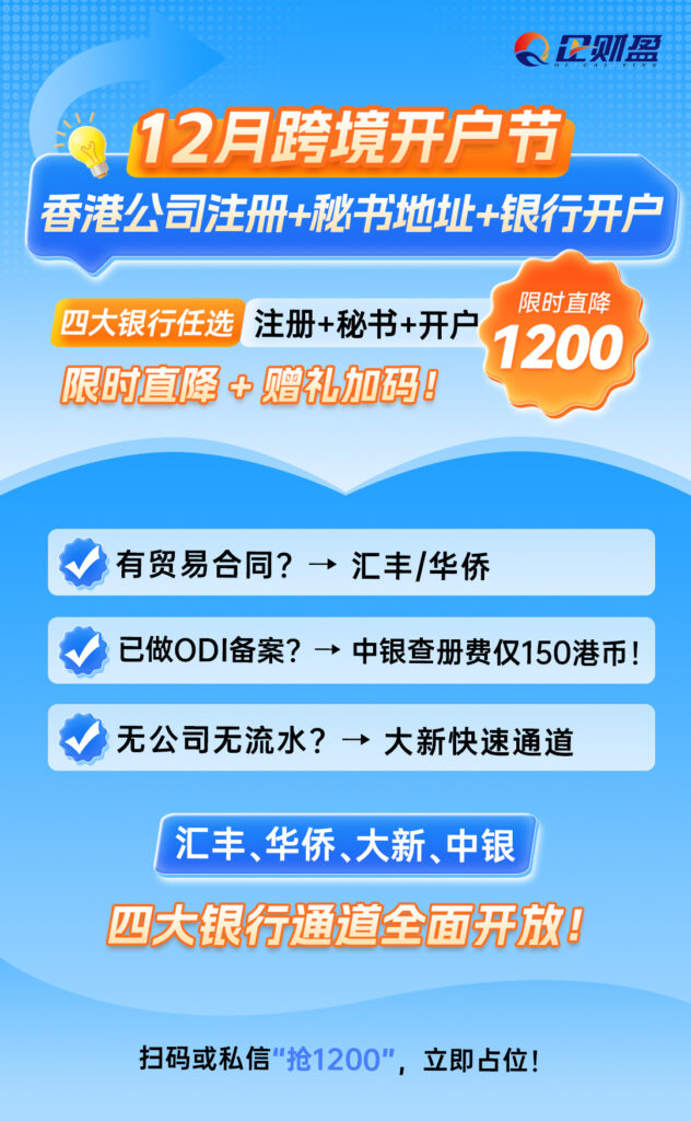 企财盈集团12月跨境开户节强烈推荐:香港公司注册+秘书地址+银行开户套餐,限时直降1200米+赠礼加码,活动已过期,详情请具体咨询,电话同V:13045886252。
