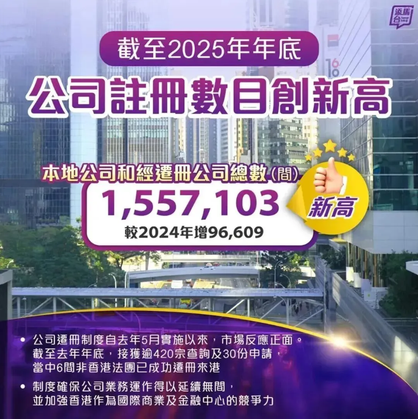 2025年,香港新成立的本地公司与经迁册公司合计达19.53万家,同比增长34.7%。截至年底,全港注册公司总数更突破 155.7 万间,创下历史新高,同比增长6.6%。