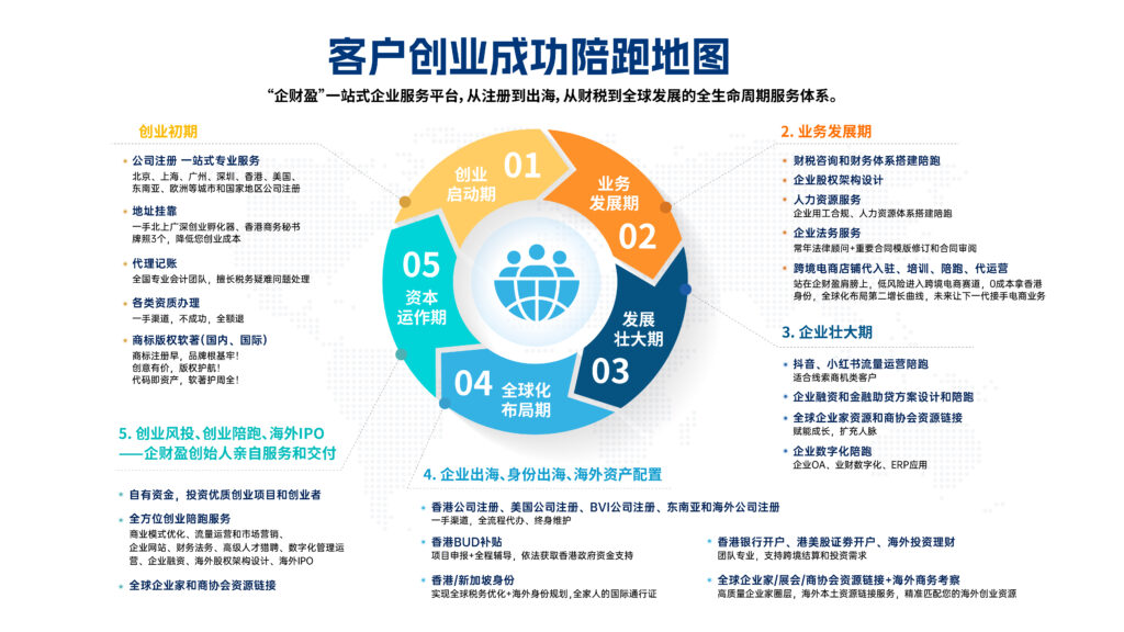 企财盈集团,自2015年创立以来,始终秉承 “赋能每一个创业梦想” 的使命,专注于为企业提供一站式全球化工商财税与商务服务。