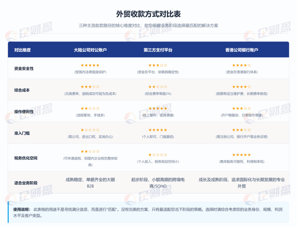 首先看“身份”与“规模”。个人/SOHO起步,第三方平台是现实选择;拥有大陆公司但业务量不大,可继续使用对公户;一旦业务量突破“温饱线”,就应立刻筹划香港账户。
