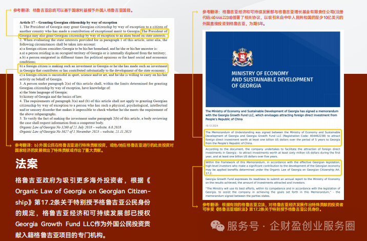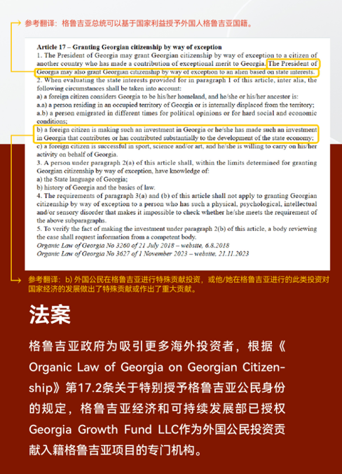 格鲁吉亚特殊贡献(公民)项目:格鲁吉亚明确立法保障投资贡献获得公民身份,根据《organic Law of Georgia on Georgian Citizenship》第172条,特别授予符合条件的外国公民格鲁吉亚公民身份。