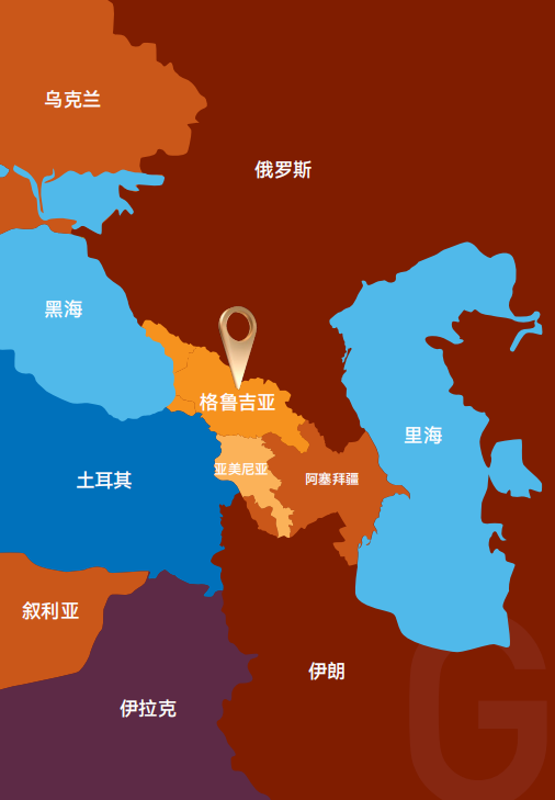 格鲁吉亚(Georgia),位于南高加索中西部。北接俄罗斯,东南和南部分别与阿塞拜疆和亚美尼亚相邻,西南与土耳其接壤,西邻黑海。