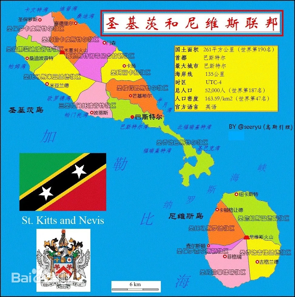全国划分为15个区(圣基茨岛10个区、尼维斯岛5个区),人口4.77万(2023年),黑人占94%,首都巴斯特尔。