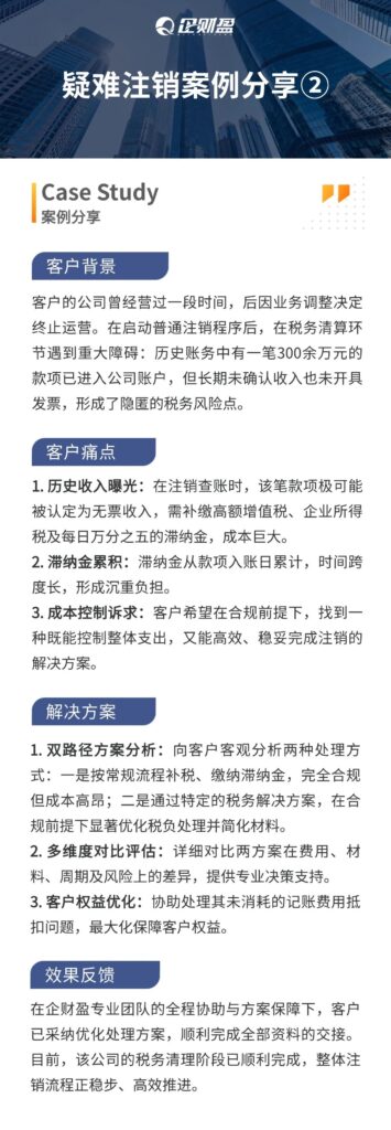 今天分享企财盈真实的客户案例,并深入解析公司疑难注销的三大核心问题,为你的企业提供清晰的解决思路。