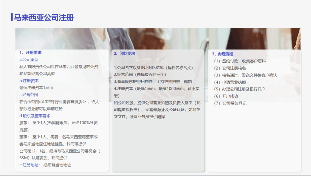 要求:至少1名本地董事(马来西亚居民或持长期签证者)。