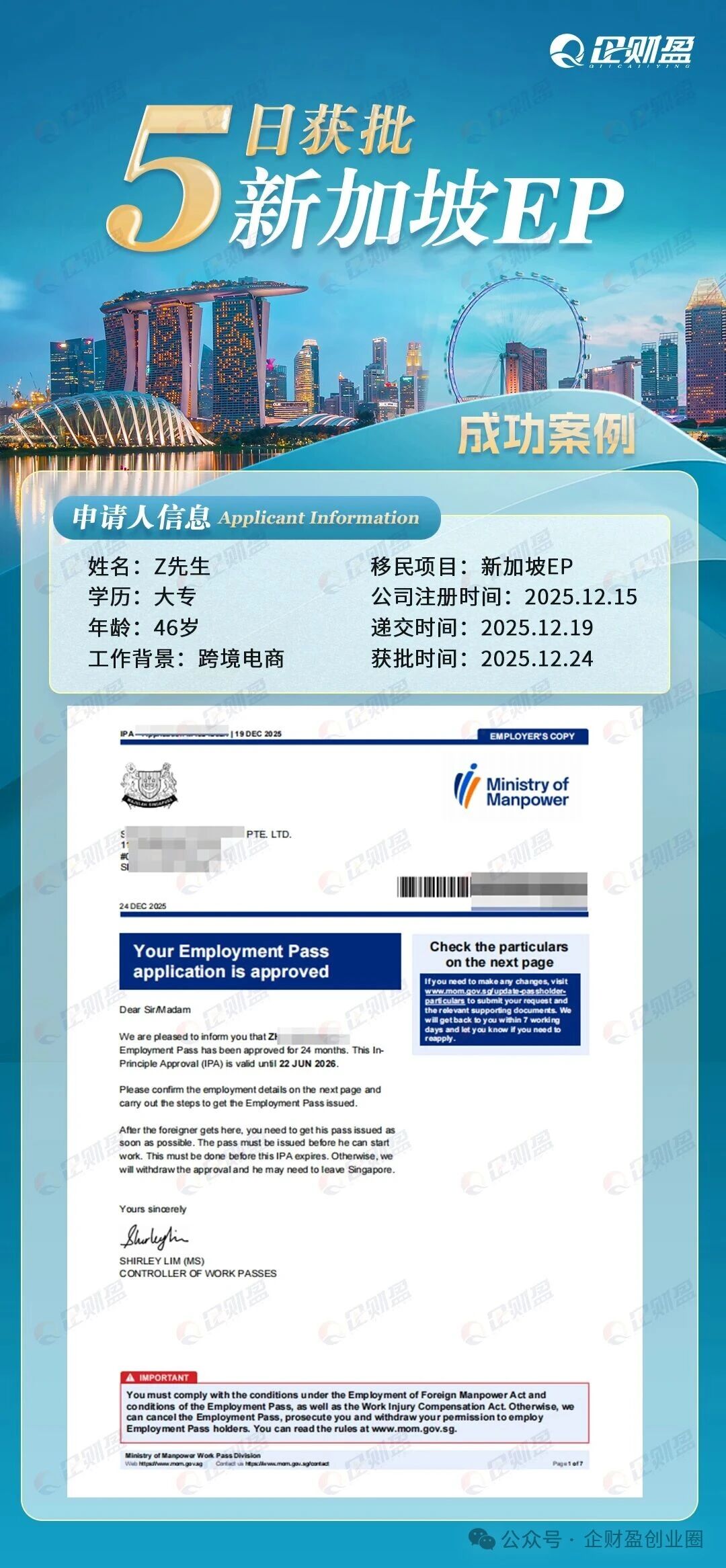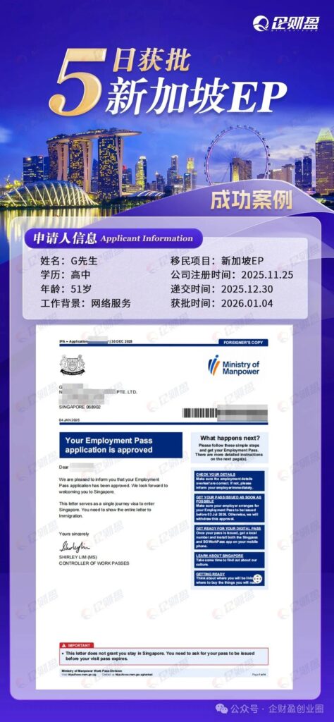 2)与公司注册的联动性需先完成新加坡公司注册,再以自雇身份(公司董事 / 股东)提交 EP 申请;新加坡公司的注册资本、业务规划、财务状况将作为 EP 申请的重要评估依据。