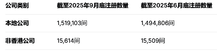 According to the latest figures from the Hong Kong Commerce and Economic Development Bureau (HKCEDB), as of the third quarter of 2025 (end-September), the total number of local companies registered under the Companies Ordinance (CO) amounted to 1,519,103, while the total number of non-Hong Kong companies amounted to 15,614, both of which are record highs.
