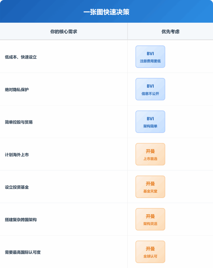 BVI: Widely accepted by global banks and business partners, suitable for trading and holding. However, it is less recognized as a listing entity than Cayman.