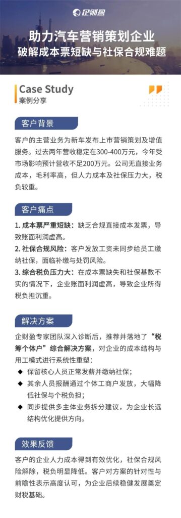 In the end, this client's enterprise manpower costs were effectively optimized, social security compliance risks were lifted, and the tax burden was significantly reduced. The client highly recognizes the relevance and foresight of this program, which lays a good financial and tax foundation for the subsequent sound development of the enterprise.