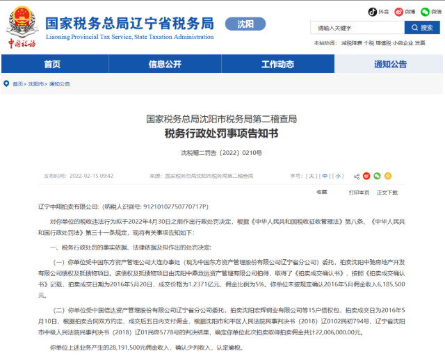 In 2021, the Liaoning Shenyang Tax Inspection Bureau received a report from the public and went to investigate.It was verified that the canceled enterprise had obtained two auction commission incomes totaling 28,191,500 yuan in May 2016 without declaring them, which was defined as tax evasion by the competent tax authorities.