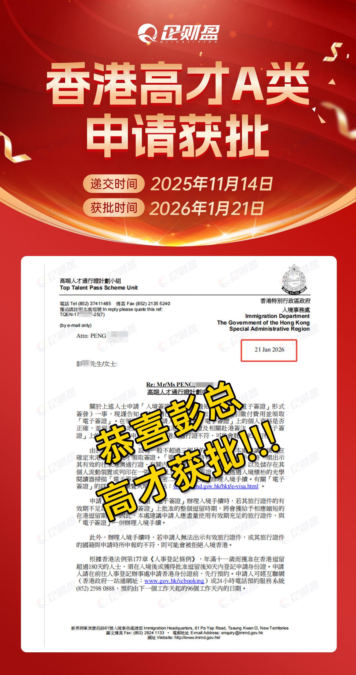 Today, we would like to share with you a successful client case of Hong Kong High Talent Pass Type A application: With professional services, the team of Enterprise Cai Ying has successfully approved the Hong Kong identity for Ms. D of a network technology company in just 2 months.