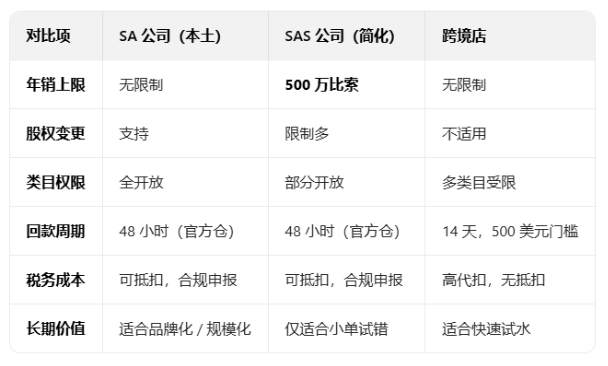 核心关键是因为墨西哥SA公司无销售上限、股权可变更、运营更合规,适合长期深耕美客多单站点;对比跨境店获流量 / 时效 / 回款优势,对比 SAS 公司规避500 万比索年销封顶风险。